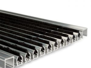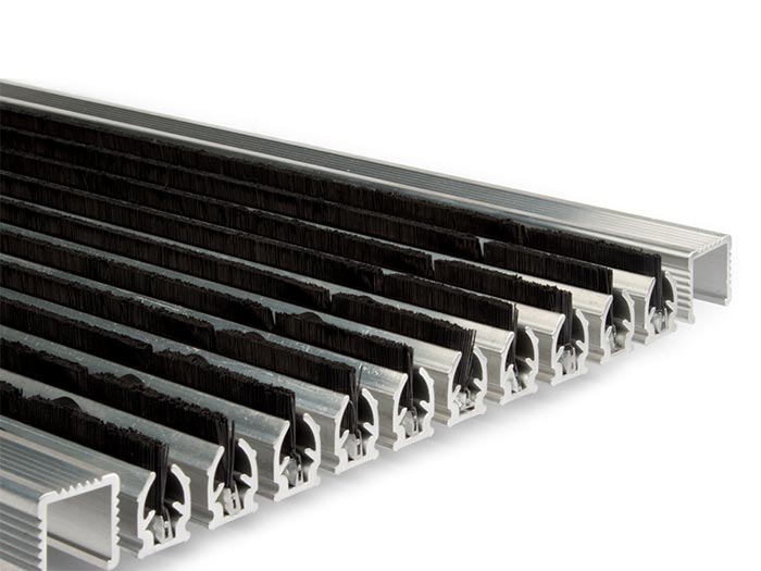 Trägerprofile - Aluminium - Metalllegierung 6060T6 Reinigungseinlage: Kratzkante: Nylon 0,4mm Stahlseil - fi 2 Distanzbüchsen: Breite 3mm, 5mm, Härte 75Sh Vernickelte Klemmschlüssel, Trittschalldämmung (unterseitig) |