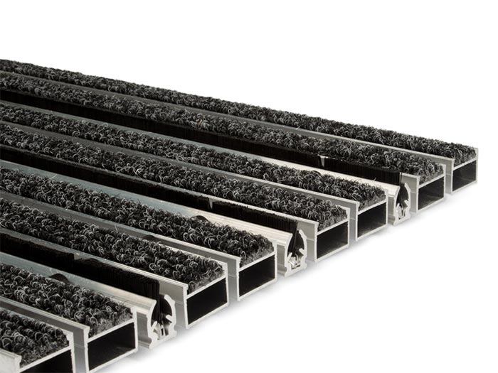 Trägerprofile - Aluminium - Metalllegierung 6060T6 Reinigungseinlage: Teppichboden (Rips) - Polypropylen Stahlseil - fi 2 Distanzbüchsen: Breite 3mm, 5mm Härte 75Sh Vernickelte Klemmschlüssel, Trittschalldämmung (unterseitig) |