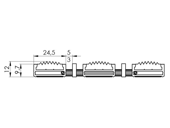 Trägerprofile - Aluminium - Metalllegierung 6060T6 Reinigungseinlage: Rippen - Gummi (7 Rippen) - PVC - 72Sha Stahlseil - fi 2 Distanzbüchsen: Breite 3mm, 5mm, Härte 75Sh Vernickelte Klemmschlüssel, Trittschalldämmung (unterseitig) |